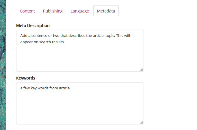 Once your content is in place. Click on the tab called "Metadata" in the description box add a few sentences about the blog, as this is the information that appears in search results this should be engaging and descriptive. In the second box add a few keywords from the article.